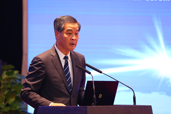 全國政協(xié)副主席、中國社會科學(xué)院“一帶一路”國際智庫專家委員會名譽(yù)主席梁振英致辭。本網(wǎng)記者 張哲 攝