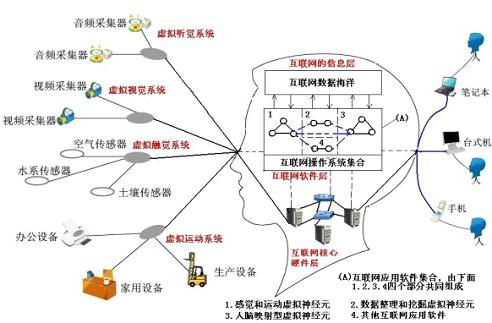 Google的街景系統,中國水利部的防汛抗旱傳感器網絡,醫院的遠程手術讓我們聯想到生物的視覺,軀體感覺和運動神經系統。到2008年我們發表論文,繪制出這樣一張互聯網虛擬大腦結構圖。