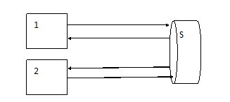 建立一個中心光交換節點S,有設備1、2,每個設備都有輸入和輸出兩條通訊鏈路與S連接,此時結構圖如下。