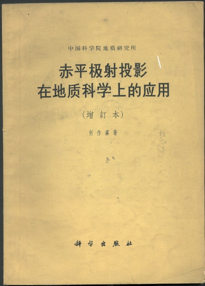 “極射赤平投影”不僅是研究巖組學(xué)的重要工具,而且也是地質(zhì)構(gòu)造研究方面的方法典范,在地質(zhì)學(xué)上廣泛應(yīng)用。何作霖是我國第一個(gè)對(duì)該方法在地質(zhì)科學(xué)上應(yīng)用做綜合闡述者。他集多年的理論研究、科研實(shí)踐及各國零散資料撰寫出版了《赤平極射投影在地質(zhì)科學(xué)中的應(yīng)用》(科學(xué)出版社,1958)一書,深受巖礦工作者喜歡,后又多次再版。這是世界上第一部這方面的專著,也是中國構(gòu)造地質(zhì)學(xué)和巖石礦物學(xué)工作者長期必讀的重要工具書。