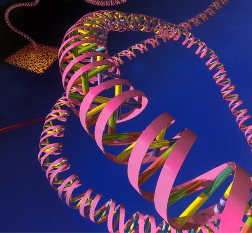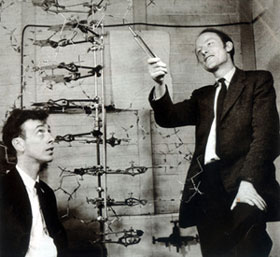 1953年4月25日,世界權(quán)威雜志《自然》雜志發(fā)表了沃森、克里克的一篇900多字優(yōu)美精煉的短文,宣告了DNA分子雙螺旋結(jié)構(gòu)模型的誕生。這個結(jié)構(gòu)模型的要義是:DNA是一個長長的雙鏈分子,由兩條同軸反向相互纏繞的多核苷酸鏈組成,外側(cè)是由脫氧核糖和磷酸根組成的分子骨架,中間是由互補的堿基對組成的階梯,堿基配對方式是A配T,C配G;堿基對間距為0.34納米,每10個堿基對形成一個螺旋周期,螺旋直徑為1納米。這個模型既能從螺旋性、分子直徑、堿基對的幾何學(xué)尺度等方面闡明X射線衍射圖像,又能以堿基專一性互補配對來解釋查伽夫當(dāng)量定律。DNA雙螺旋結(jié)構(gòu)是一個極為成功、無懈可擊的DNA分子結(jié)構(gòu)模型,它由兩條右旋但反向的鏈在同一個軸上盤而成,像一個螺旋形的梯子,生命的遺傳密碼就列在梯子橫檔上。據(jù)科學(xué)家統(tǒng)計,一個體細胞的全部DNA“螺旋樓梯”長約2米。若將一個人的全部DNA連接起來,可以在地球和太陽之間扯上80個來回。 DNA分子雙螺旋結(jié)構(gòu)模型的發(fā)現(xiàn),是生物學(xué)史上的一座里程碑; 1962年,沃森、克里克因發(fā)現(xiàn)DNA分子結(jié)構(gòu),與改進了X射線衍射技術(shù)的威爾金斯一起獲得了諾貝爾醫(yī)學(xué)或生理學(xué)獎。
