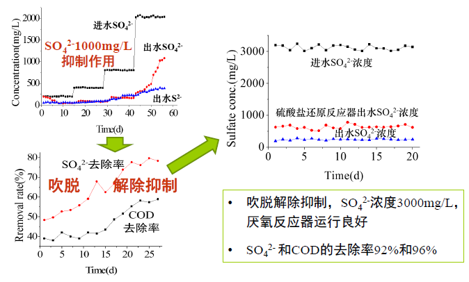 硫化氫對厭氧消化的抑制一直是影響處理效果的重要因素,我們采用載氣將硫化氫吹脫,降低其對產甲烷菌活性的抑制,發現經吹脫后硫酸鹽去除率明顯增高,提高了厭氧消化反應效率(圖1-10)。