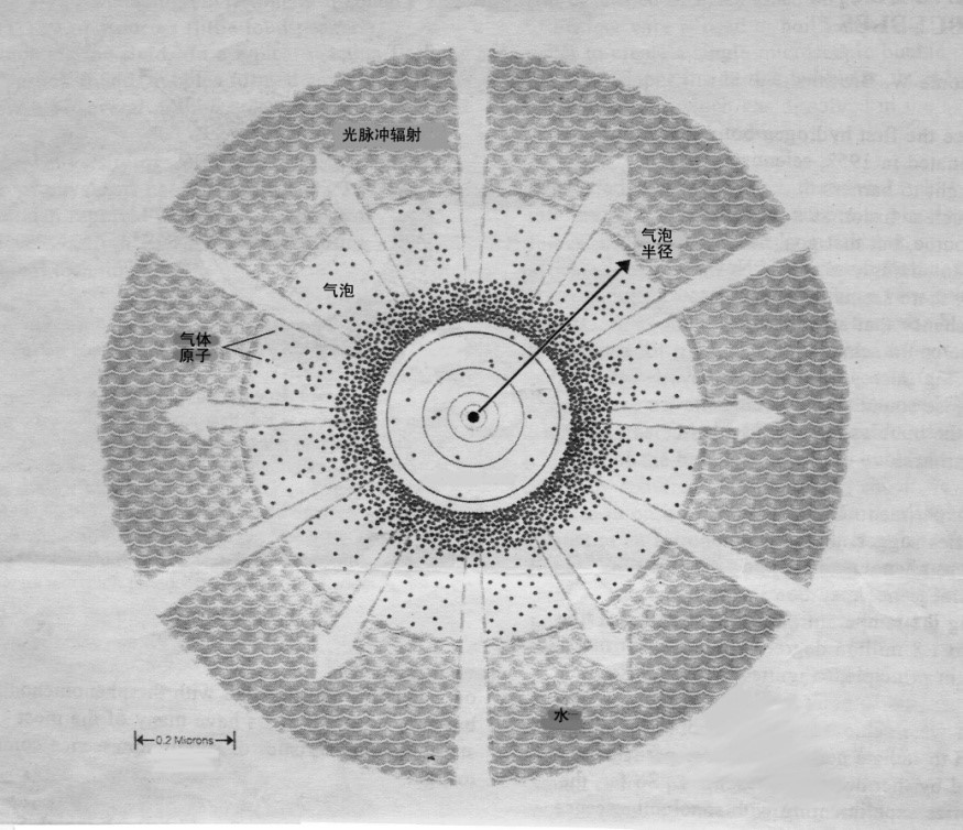 氣泡聲致發光如圖所示。氣泡外面是水。這個氣泡在超聲波的作用下,一會變大一會變小,氣泡里的小黑點代表氣體里的分子和原子。圖中標尺的長度是0.2微米。氣泡在塌縮到一定程度時就發出光。
