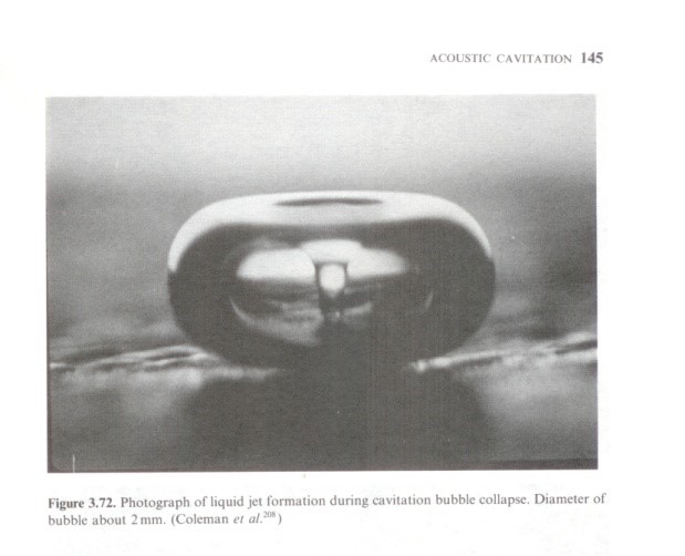 再解釋一下氣泡的潰滅。氣泡的潰滅與氣泡的破滅是完全不同的過程。氣泡的潰滅是指氣泡由大變小,最后變沒的過程,這不同于氣球由小到大最終破滅的過程。破滅產生不了高溫、高壓,只有潰滅才能產生高溫、高壓。我們講氣泡的潰滅,有的人叫湮滅,有的人叫塌縮等等,這是學術上的不同說法。