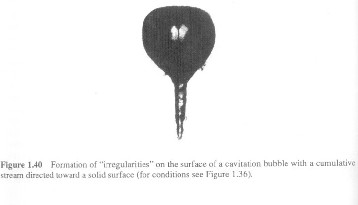 當氣泡靠近容器壁時,氣泡的形狀會持續變化,變到后來長出一個尾巴,像錐子一樣,錐子尖指向容器壁。這是氣泡典型的形狀,如圖3所示。通常人們會認為氣泡是一個球,但現在看來并非如此。首先,這個錐形是非常尖的;第二,它是非常有力的,呈向外噴射狀。它碰到固體的邊時,會打擊出一個小窟窿、一個麻點,所以超聲波作用時間長了以后,固體的邊和拋光的面就會變毛。正因為這個力量是非常大的,作為超聲清洗的機理之一,即超聲波可以清洗骯臟的油、污漬等等。它的條件是一定要靠近固體邊,就是氣泡和固體邊相互作用。所以通過這兩張圖,我們能看出來,空化氣泡里面研究的學問是很深的。