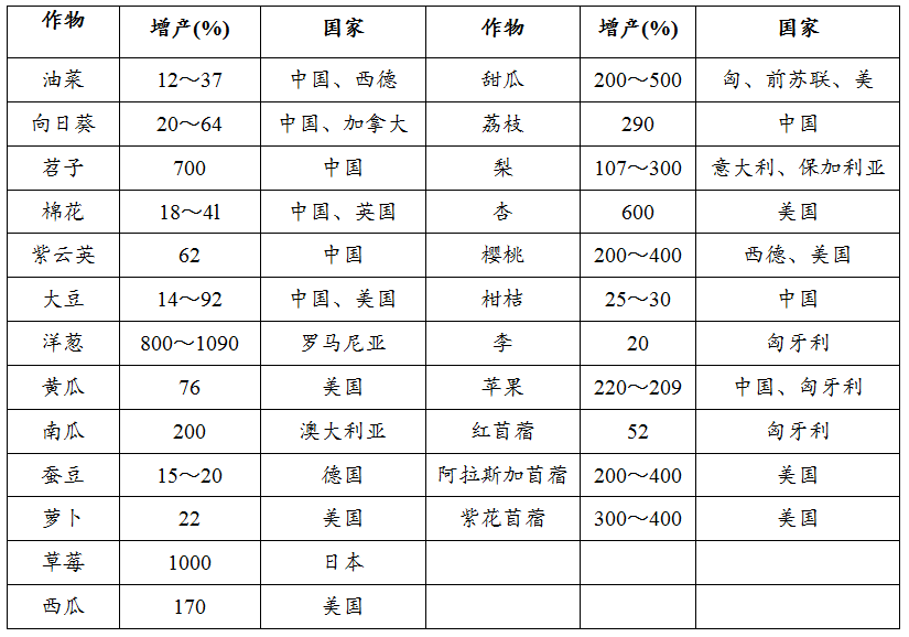 表1 國(guó)內(nèi)外用蜜蜂為農(nóng)作物和果樹(shù)授粉的增產(chǎn)效果