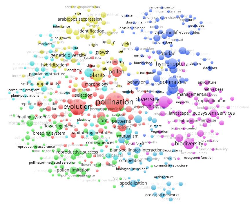 與此同時(shí)我們還通過(guò)ESI對(duì)pollination和pollinator等關(guān)鍵詞進(jìn)行檢索,可以大致得出傳粉昆蟲(chóng)研究領(lǐng)域的現(xiàn)有研究前沿如下:1)常用新煙堿類(lèi)殺蟲(chóng)劑對(duì)蜜蜂的殺傷作用;2)野生授粉昆蟲(chóng)對(duì)農(nóng)業(yè)增收和作物健康的積極影響;3)傳粉昆蟲(chóng)種群測(cè)量與評(píng)估;4)花朵與傳粉昆蟲(chóng)的生態(tài)聯(lián)系。通過(guò)利用Vos Viewer軟件繪制傳粉生物學(xué)關(guān)鍵詞共現(xiàn)(co-occurrence)聚類(lèi)圖,獲得傳粉生物學(xué)領(lǐng)域的研究熱點(diǎn)包括:1)傳粉昆蟲(chóng)的形態(tài)學(xué)、系統(tǒng)進(jìn)化、分類(lèi)學(xué)方面的研究;2)傳粉昆蟲(chóng)介導(dǎo)的植物繁殖、選育、選種等的研究,以及花粉限制對(duì)傳粉昆蟲(chóng)的影響;3)殺蟲(chóng)劑導(dǎo)致傳粉昆蟲(chóng),尤其是蜜蜂、熊蜂的種群下降的影響;4)傳粉昆蟲(chóng)介導(dǎo)的植物基因表達(dá)、生長(zhǎng)、增產(chǎn)等;5)景觀變化、城市化等環(huán)境因素導(dǎo)致生物多樣性降低、傳粉服務(wù)功能下降、傳粉昆蟲(chóng)群體數(shù)量下降等影響評(píng)估,并提出相關(guān)的控制與管理措施;6)植物-傳粉昆蟲(chóng)互作與共生、植物與傳粉昆蟲(chóng)形成的生態(tài)網(wǎng)絡(luò)結(jié)構(gòu)等方面的研究;7)傳粉使植物基因流擴(kuò)散,使植物基因變異和多樣性。