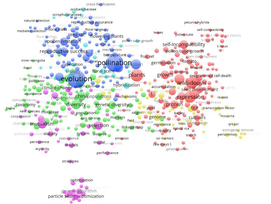 利用Vos Viewer軟件分析2013-2017年中國(guó)傳粉生物學(xué)領(lǐng)域的SCI論文,獲得中國(guó)傳粉生物學(xué)領(lǐng)域的研究熱點(diǎn)是:1)植物花粉管生長(zhǎng)、發(fā)育等分子、細(xì)胞層面基礎(chǔ)機(jī)制研究;2)傳粉昆蟲(chóng)的分類(lèi)學(xué)研究,及其遺傳多樣性、保護(hù)、種群擴(kuò)散等方面的研究;3)昆蟲(chóng)傳粉在植物遺傳育種、進(jìn)化中發(fā)揮重要作用;4)與傳粉相關(guān)的植物轉(zhuǎn)錄因子、microRNA、殺蟲(chóng)劑耐藥性等方面的研究;5)傳粉昆蟲(chóng)的種群優(yōu)化、傳粉昆蟲(chóng)互作等方面的研究。